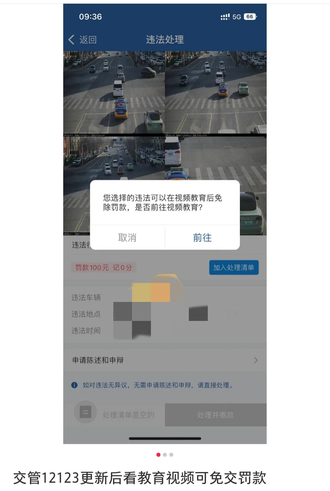 车主在点击前往后观看了一段交通教育视频,最终页面显示该违法行为处理成功,处罚方式为警告,罚款0元记0分。