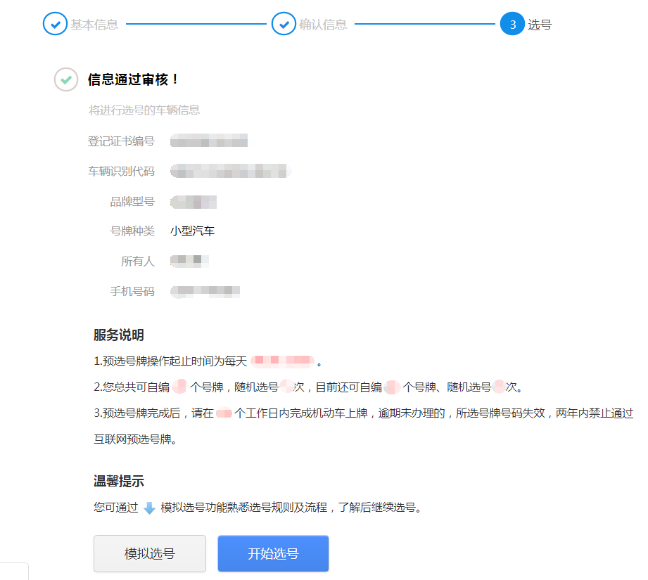 如果自编号牌验证通过,系统将自动确认号牌,用户即完成预选号,进入第二阶段步骤3【完成号牌预选】。