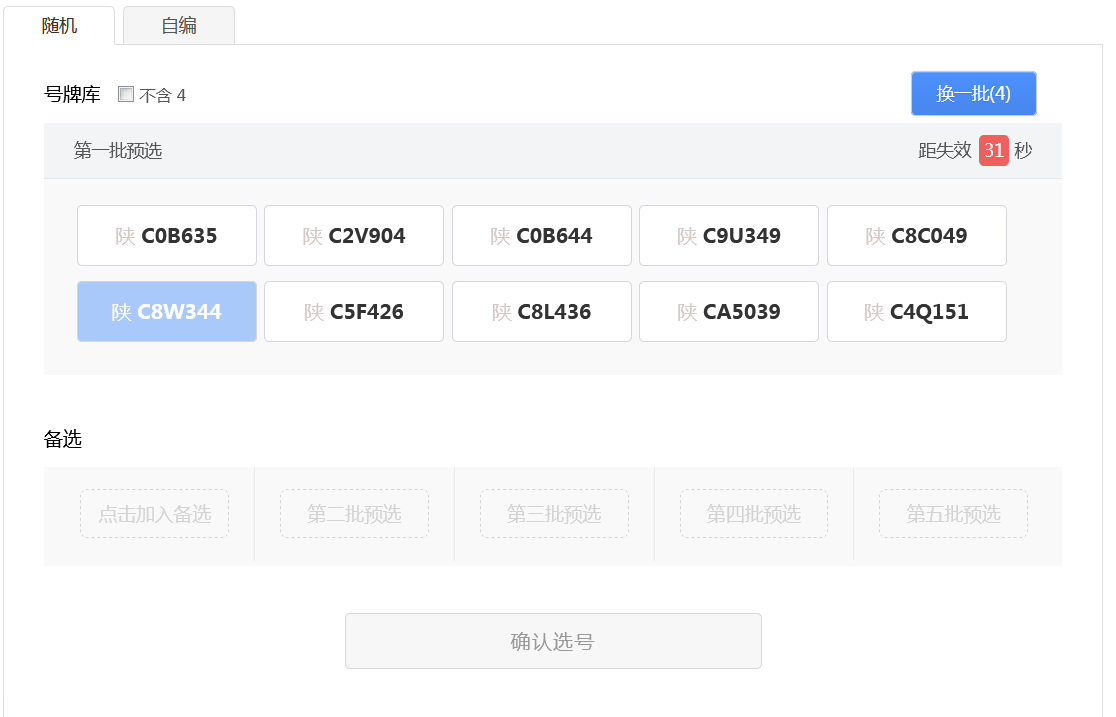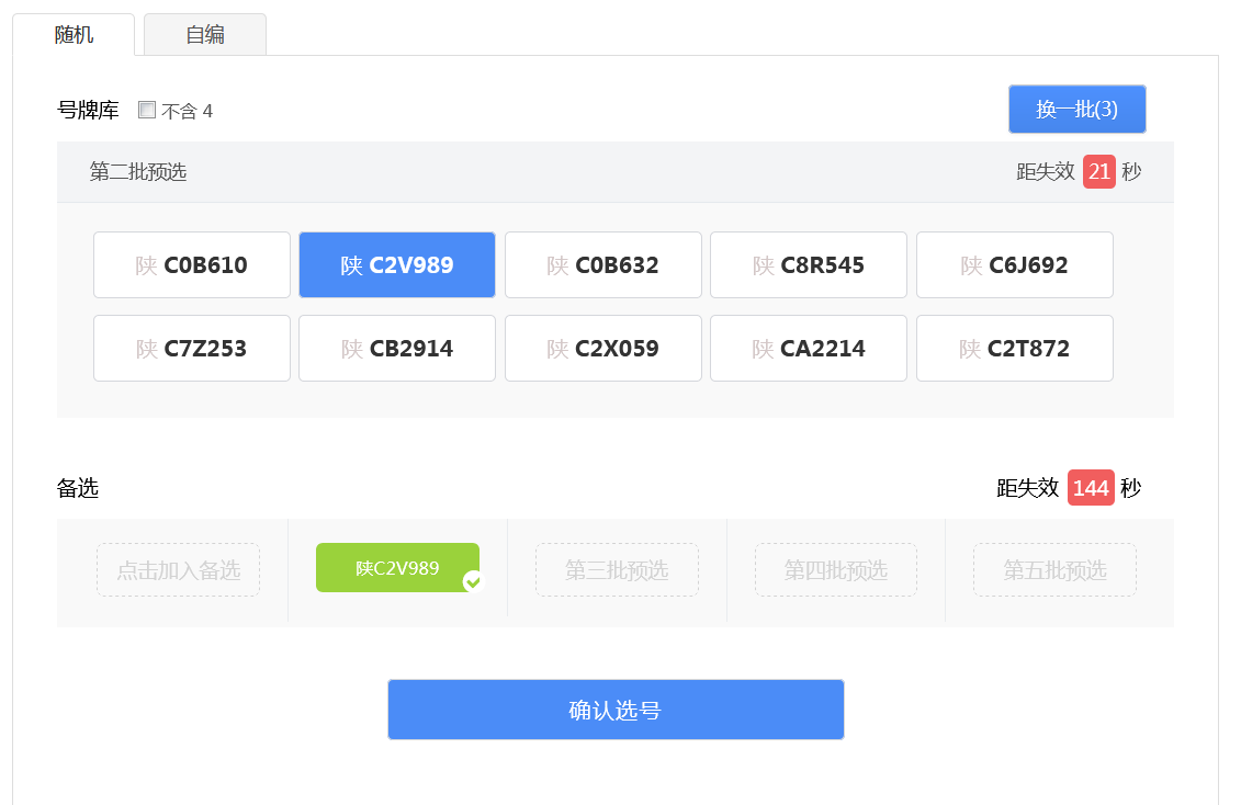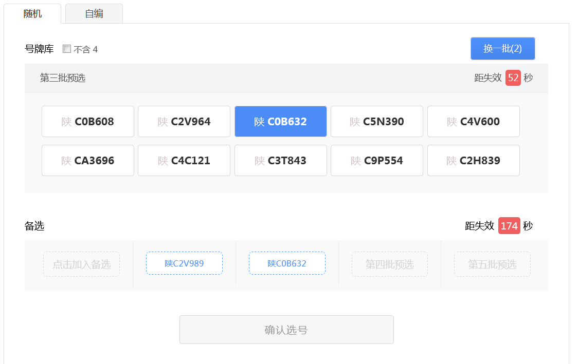 用户可以点击右上角“换一批”按钮重新进行随机(“换一批”后面的括号中的数字为用户当前选号车辆的剩余随机选号次数),此时会更新随机号牌栏中的号牌。 如果备选号牌栏中的有号牌并且没有失效,则备选栏中的倒数将重新开始倒数。 用户可以在新随机的号牌号码中选择一个号牌号码作为备选号牌,此时备选栏中的倒数也将重新开始倒数。如下图所示。 如此循环操作,用户每次随机选号,都可以从随机号牌中选择一个号牌号码作为备选号牌,直到随机选号次数用完。