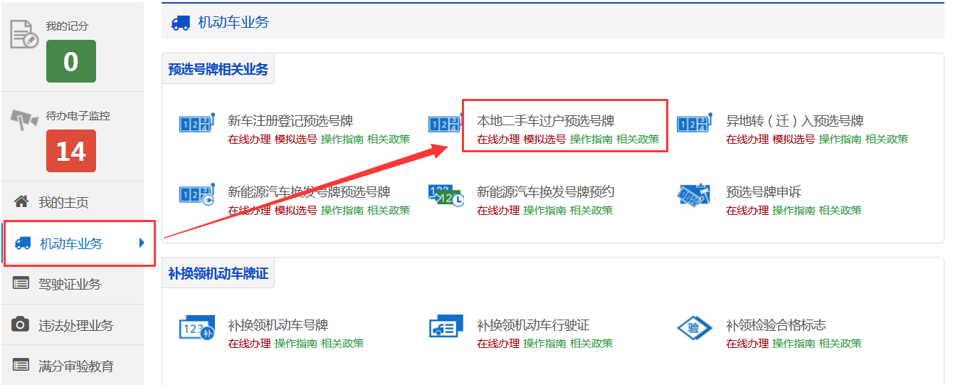互联网注册用户在互联网登录后,点击【机动车业务】→【预选号牌相关业务】下的【本地二手车过户预选号牌】进入预选号牌流程。如下图所示。
