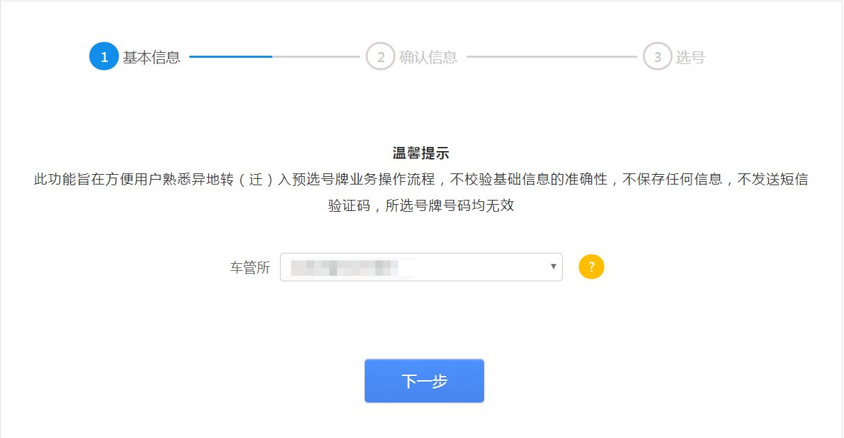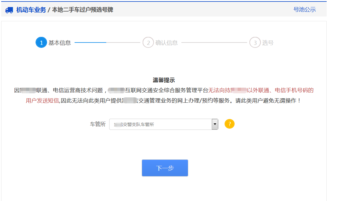 用户首次进入该功能,系统将显示预选号牌服务说明页面,点击页面中【提交信息】按钮,进入第一阶段【基本信息】步骤,应选择本人或本单位办理本地二手车过户业务的车管所,如下图所示。