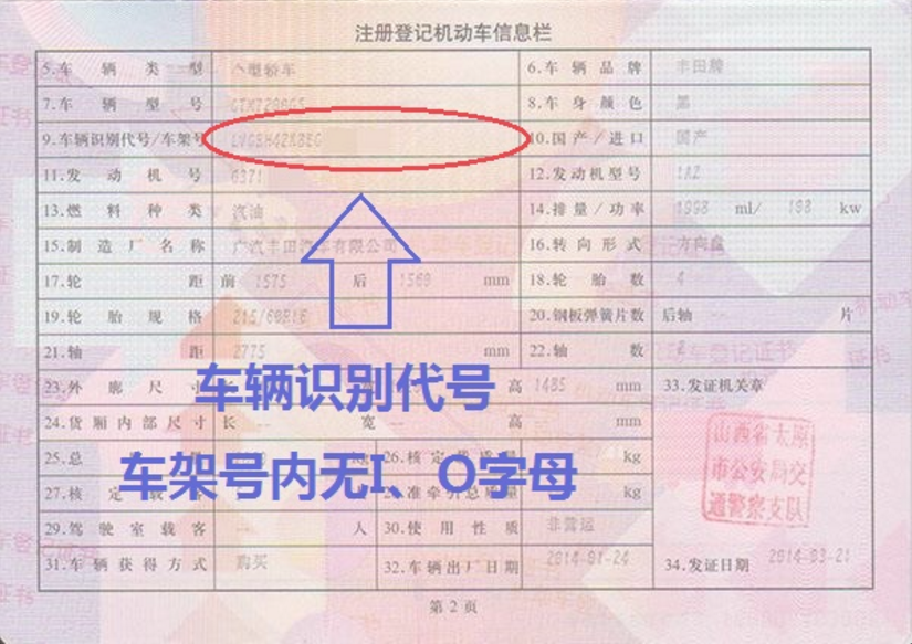 如果用户不明白车辆识别代号的概念,点击“?”按钮,会弹出车辆识别代号的说明。 如下图所示,图片的箭头指示位置为《机动车登记证书》中车辆识别代号的说明。