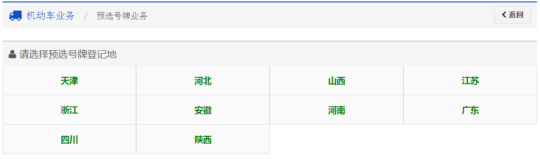 点击预选号牌服务说明页面中红色标示的“跳转到其他省市”链接,进入全国省市互联网服务平台选择界面。 用户根据本人新购二手普通小型汽车需要上牌的车管所选择相应的省市,系统会自动跳转到用户选择的省市互联网服务平台的预选号牌pa8九游会首页。如下图所示: