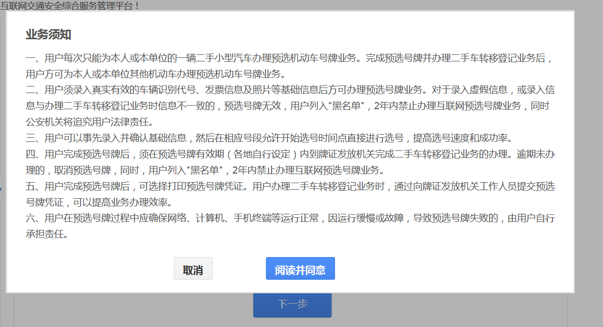 点击上图中的【下一步】按钮时,系统会弹出业务须知的对话框,界面如下图所示,业务须知具体内容由各地自行维护,下图只是示例,不代表本平台选号的业务须知内容。 请用户在预选号牌时务必仔细阅读业务须知,了解业务相关规则。用户点击对话框中的【阅读并同意】按钮进入第一阶段步骤2【确认信息】步骤。