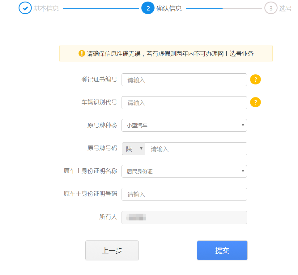 在该步骤,用户需要录入新购二手小型汽车的登记证书编号、车辆识别代号和卖方信息,如下图所示: