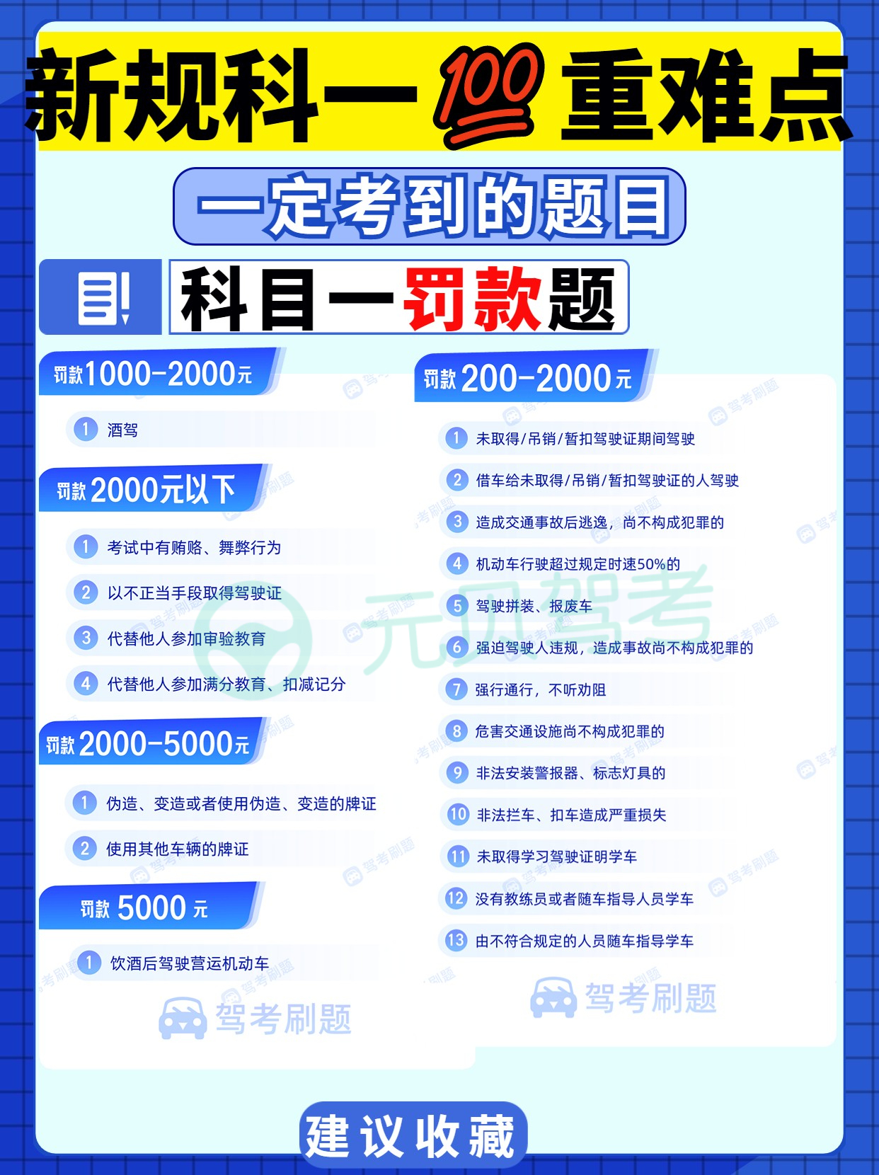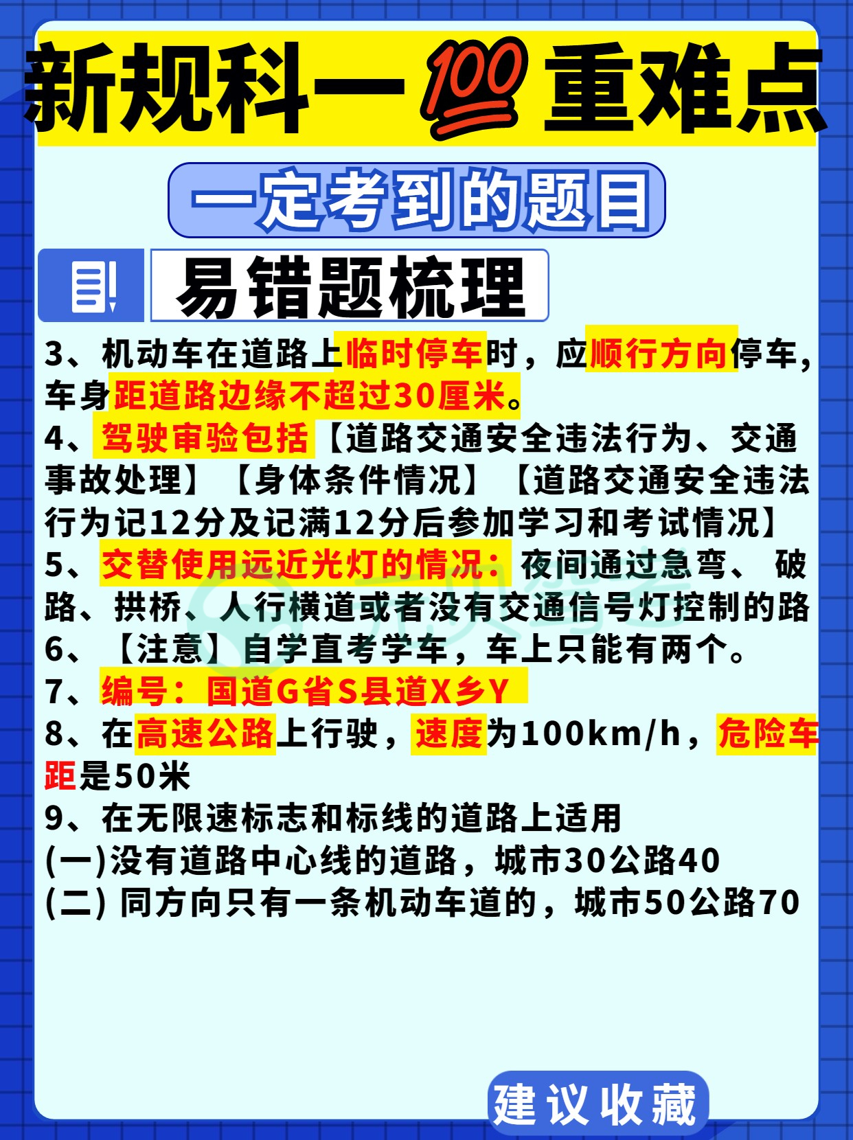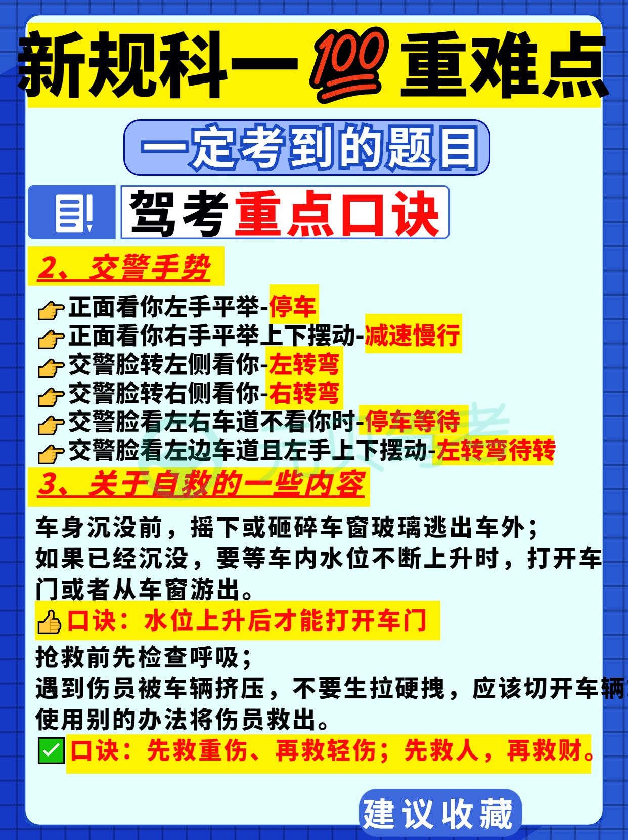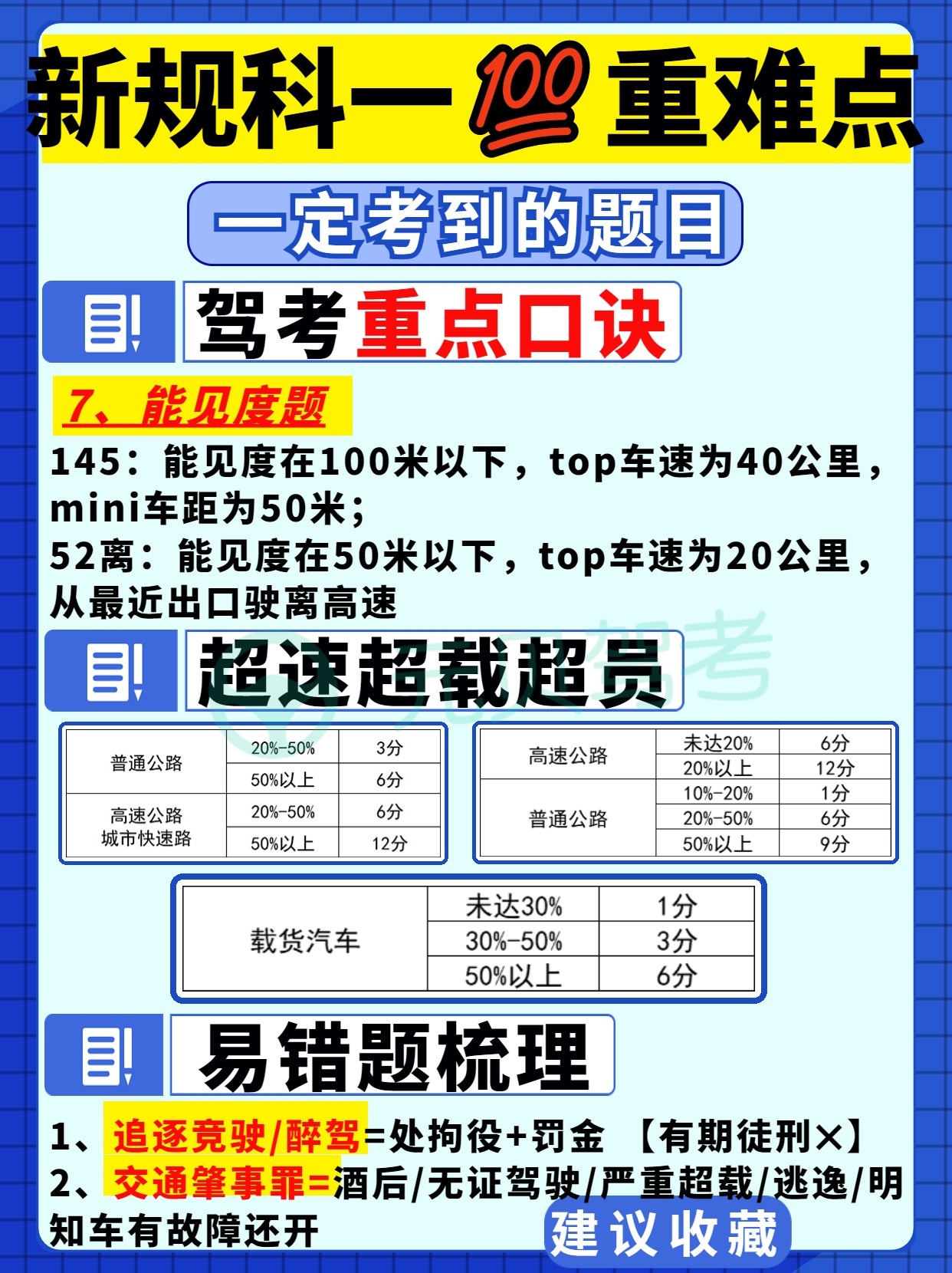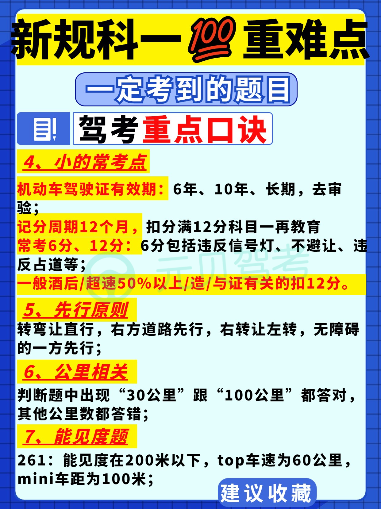 今天元贝驾考小编给大家总结了驾考新规科目一重难点、易错点——驾考新规扣分罚款、交警手势、重点口诀、先行原则、能见度、超载超速以及易错题技巧,大家务必收藏起来反复记忆!