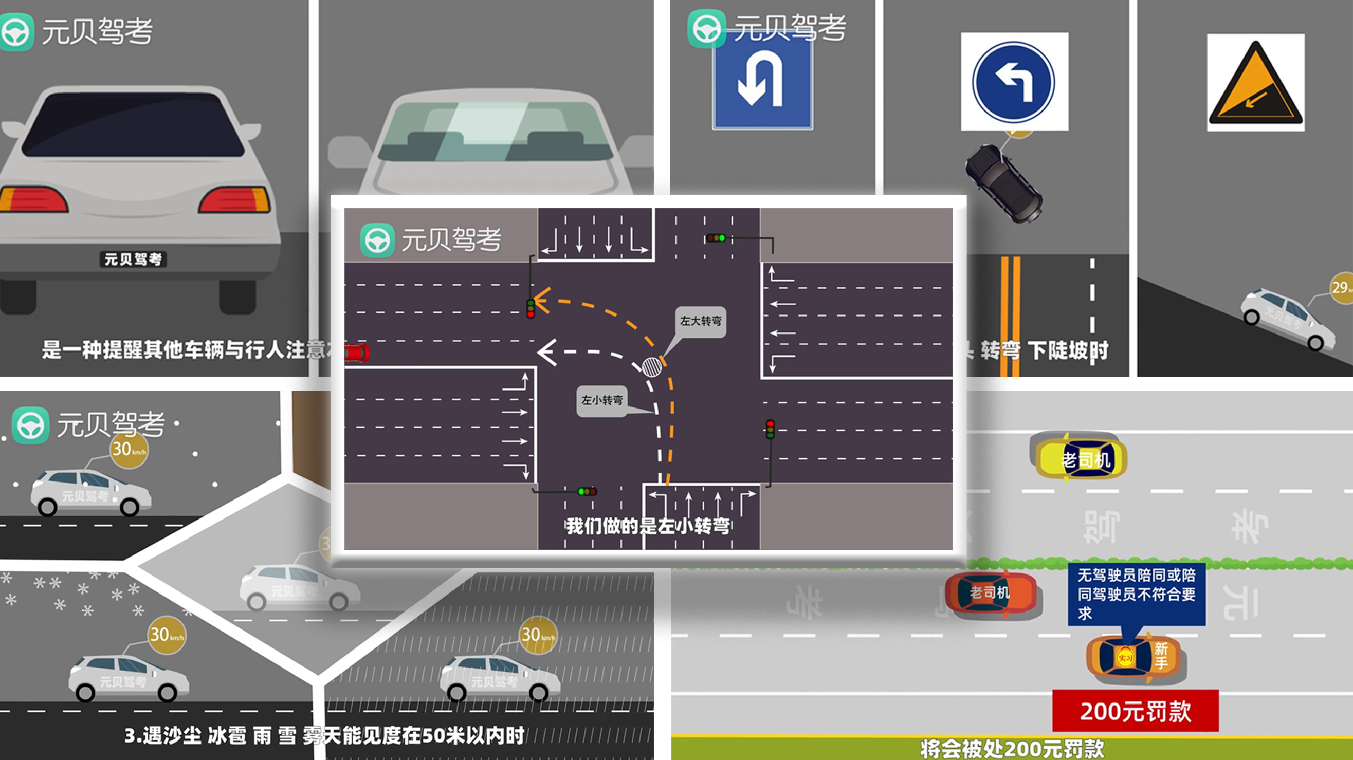 《驾考学堂》动画还原交通信号实际应用场景,路遇复杂路况下的交通信号灯不迷糊,交通标志、标线、交警手势简单记忆,拿下连老司机都掌握不好的知识点。