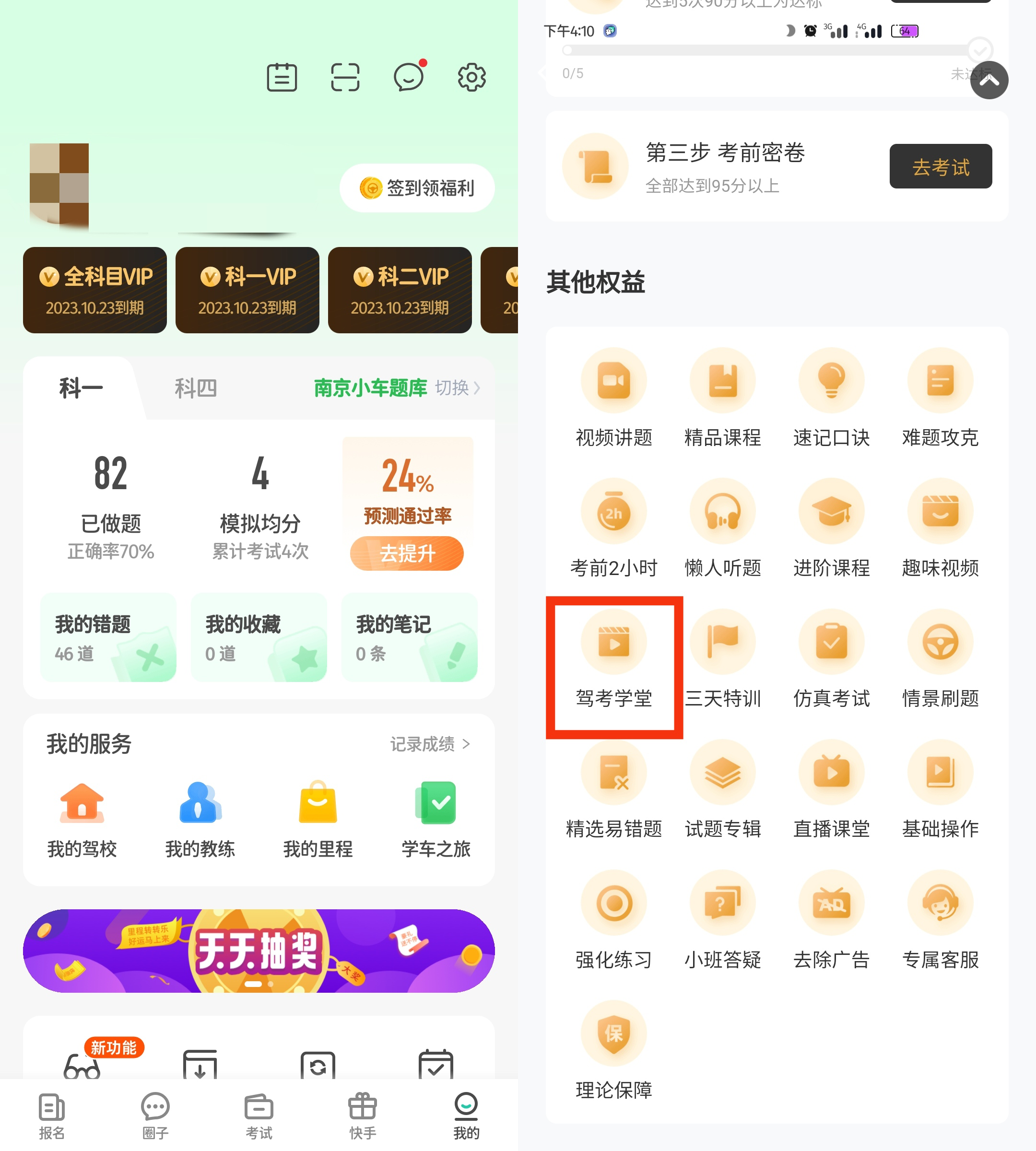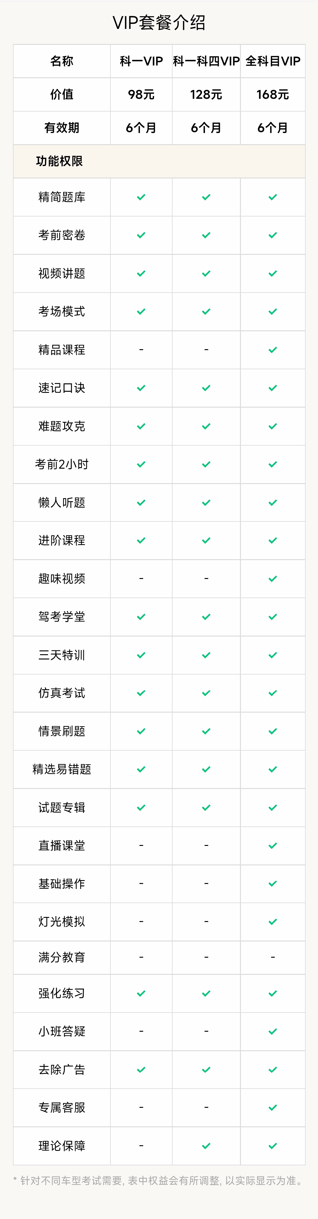 开通vip后,您可使用精简题库、驾考学堂、专属客服、懒人听题、不过补偿等多项会员专属服务,而普通用户则无权使用。