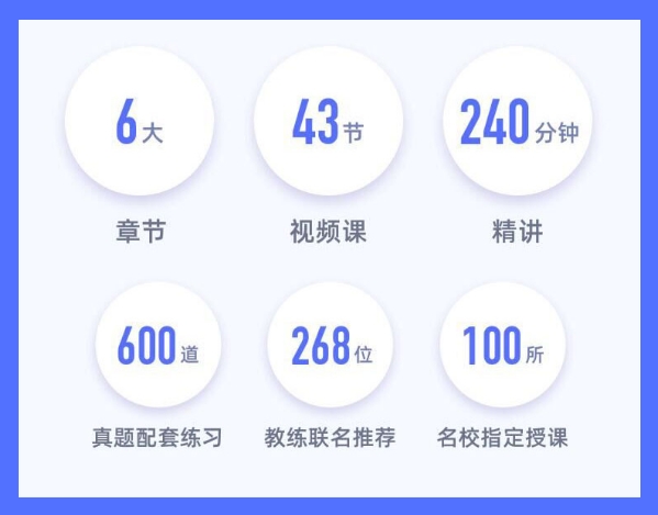 课程概述:6大章节、43节视频课程、240分钟精讲、600道真题配套练习、268位教练联名推荐、100所驾校指定授课。