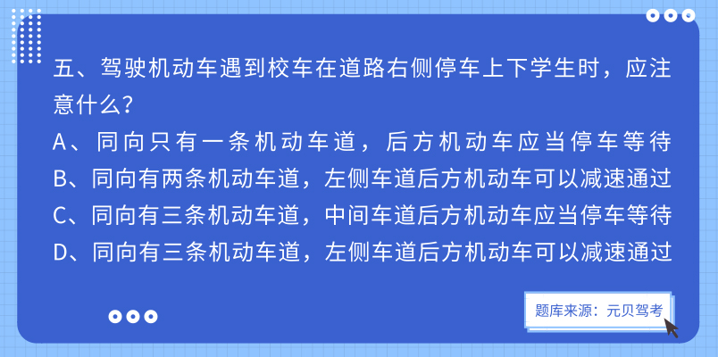 3、校车在同方向有两条以上机动车道的道路上停靠时,校车停靠车道后方和相邻机动车道上的机动车应当停车等待,其他机动车道上的机动车应当减速通过。校车后方停车等待的机动车不得鸣喇叭或者使用灯光催促校车。