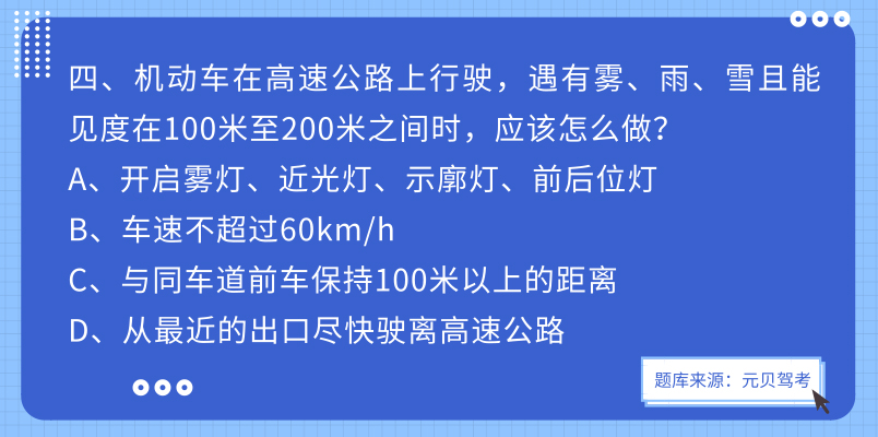 (二)能见度小于100米时,开启雾灯、近光灯、示廓灯、前后位灯和危险报警闪光灯,车速不得超过每小时40公里,与同车道前车保持50米以上的距离;