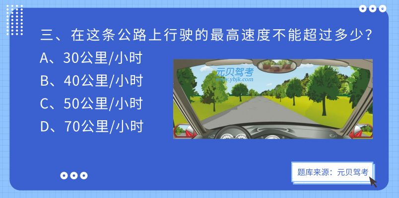 (二)同方向只有1条机动车道的道路,城市道路为每小时50公里,公路为每小时70公里。 图中道路,是没有道路中心线的公路,因此最高速度应不超过40公里/小时,本题答案应为b。
