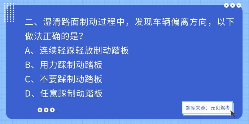 2、要是前轮一直被刹住,不松开踏板,汽车会出现方向失去控制。 湿滑路面制动的正确的做法是先握紧方向盘,不要踩刹车制动。符合要求的只有c,因此本题选c。