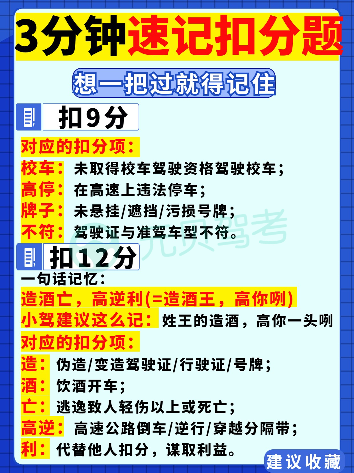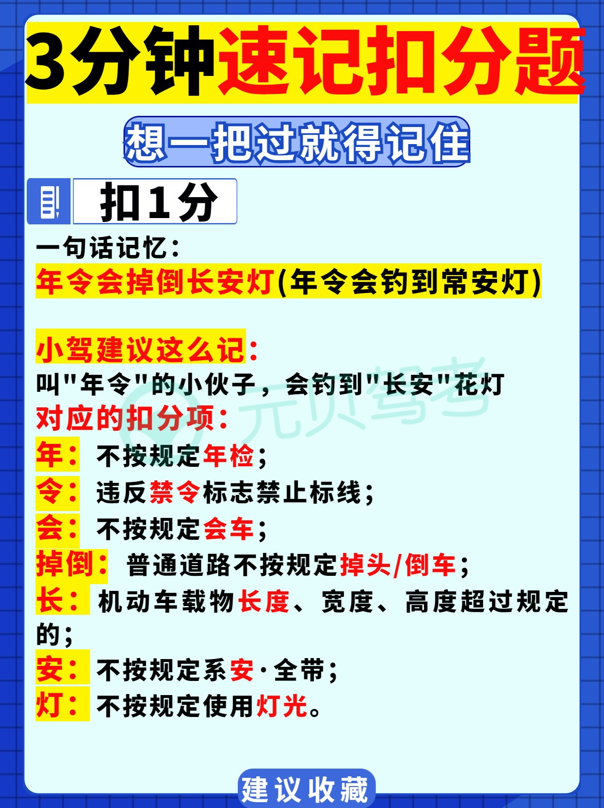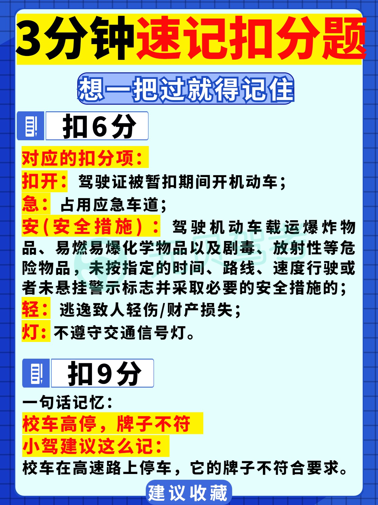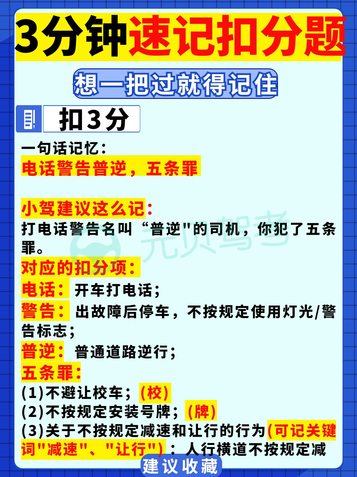 对记分题无从下手的学员,一定要认真把这篇看完!元贝驾考小编分类归纳了常考的记分题考点,而且将其整理成易记的口诀,将这些熟记在心,掌握科目一扣分题的考查重点,相信记分题难不倒你。